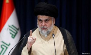 FILE PHOTO: Iraqi Shi'ite cleric Muqtada al-Sadr speaks after preliminary results of Iraq's parliamentary election were announced in Najaf, Iraq October 11, 2021. REUTERS/Alaa Al-Marjani/File Photo